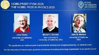 नई दिल्ली । भौतिकी (Physics) में नोबेल पुरस्कार 2025 (Nobel Prize 2025) के विजेताओं (Winners) का ऐलान कर दिया गया है। इस वर्ष जॉन क्लार्क, माइकल एच डेवोरेट और जॉन एम...