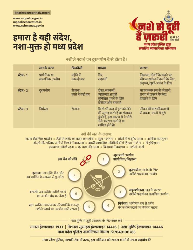 8. 22.07.2025 गणमान्य व्यक्ति, खिलाड़ी, और वरिष्ठ अधिकारियों के नशा के विरुद्ध रिकॉर्ड किये गये जन जागरूकता संदेश का सार्वजनिक स्थानों पर प्रचार प्रसार करना। सोशल मीडिया पर नशे से पीड़ित व्यक्ति द्वारा नशा छोड़ने की मोटिवेशनल स्टोरी को प्रसारित करना।