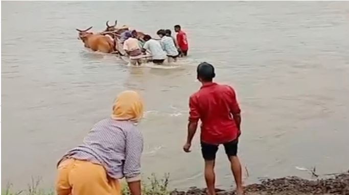 बैलगाड़ी से नदी पार कराई
