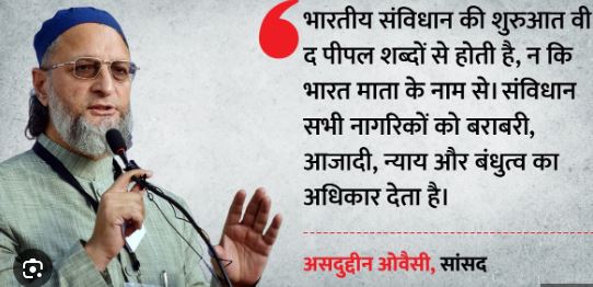 ओवैसी ने कहा कि संविधान का अनुच्छेद 25 हर नागरिक को धर्म की स्वतंत्रता का मूल अधिकार देता है। ऐसे में किसी की देशभक्ति को किसी नारे से जोड़ना सही नहीं है। उन्होंने सवाल उठाया कि क्या राष्ट्रीय गान को खत्म करने की कोशिश की जा रही है? ओवैसी ने कहा कि उन्हें अपनी वफादारी का कोई प्रमाणपत्र देने की जरूरत नहीं है। उनका कहना है कि हर नागरिक को अपने धर्म और विचारों के अनुसार जीने की आजादी है और यही संविधान की भावना है।