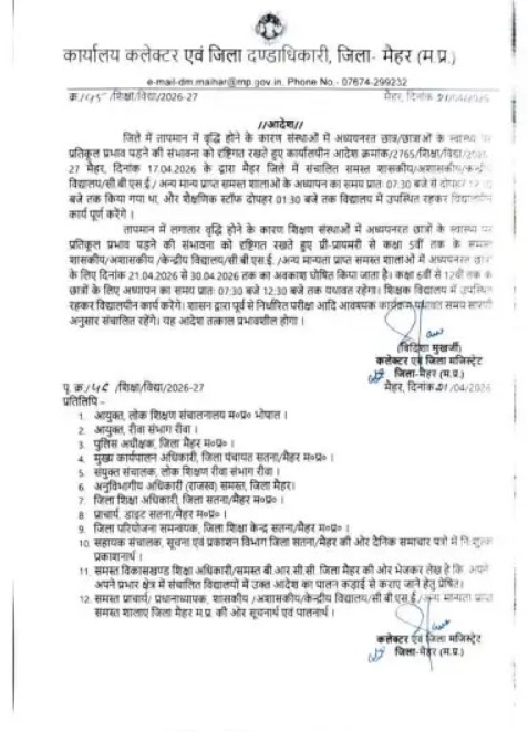 भीषण लू और बढ़ते तापमान को देखते हुए मैहर कलेक्टर मुखर्जी ने बच्चों की सेहत की सुरक्षा के लिए कड़ा फैसला लिया है.कक्षा नर्सरी से 5वीं तक के सभी स्कूलों में 21 अप्रैल से 30 अप्रैल 2026 तक छुट्टी घोषित कर दी गई है। ह आदेश सरकारी, निजी, सीबीएसई और केंद्रीय विद्यालयों सहित जिले के सभी स्कूलों पर अनिवार्य रूप से लागू होगा।कक्षा 6वीं से 12वीं तक के छात्रों के लिए स्कूल का समय सुबह 7:30 से 12:30 बजे तक निर्धारित किया गया है। शिक्षकों को दोपहर 1:30 बजे तक उपस्थित रहना होगा।