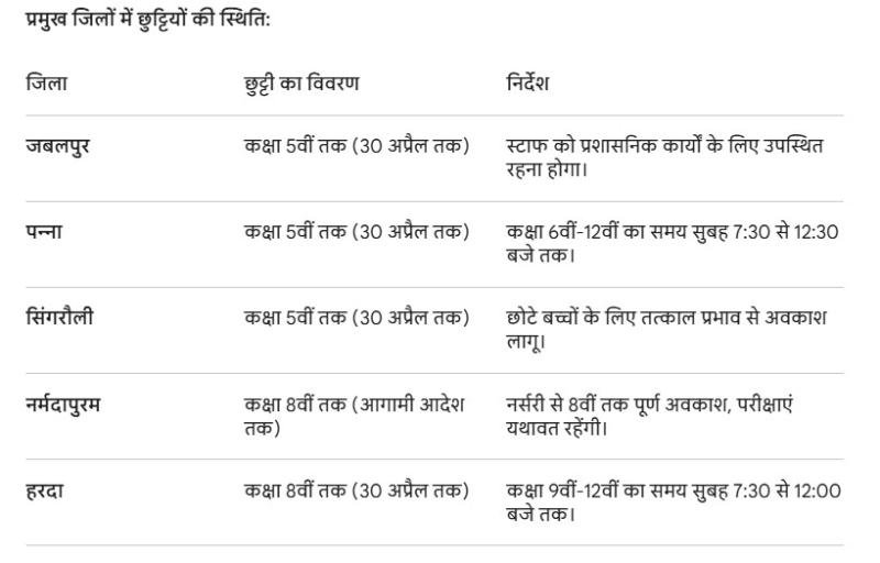 पन्ना कलेक्टर ऊषा परमार और सिंगरौली कलेक्टर गौरव बैनल ने कक्षा 5वीं तक के बच्चों के लिए 24 अप्रैल से महीने के अंत तक अवकाश घोषित किया है। बड़ी कक्षाओं (6वीं से 12वीं) के लिए समय सुबह साढ़े सात बजे से साढ़े बारह बजे तक सीमित कर दिया गया है।